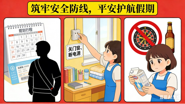 遵守学校假期规定,离开宿舍务必关闭门窗、切断电源、关闭水源,防范火灾与盗窃隐患。不使用违规电器、不私拉乱接电线,不存放易燃易爆物品。保持宿舍通风整洁,规律作息、健康饮食;外出尽量结伴,避免夜间独行。遇突发情况,及时联系学校安保部(0571-88213110)或辅导员。