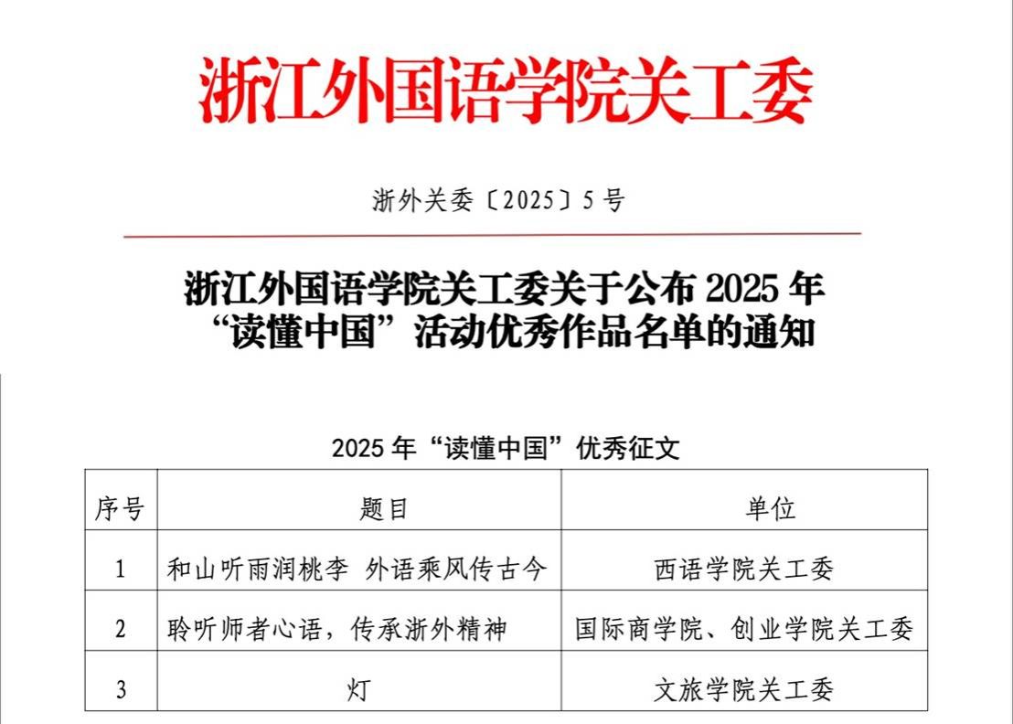 近日,在我校2025年“读懂中国”活动优秀作品评选中,由我院“商途探忆 银龄铸魂”校友寻访社会实践团撰写的《聆听师者心语,传承浙外精神》,获校级“优秀征文”奖。