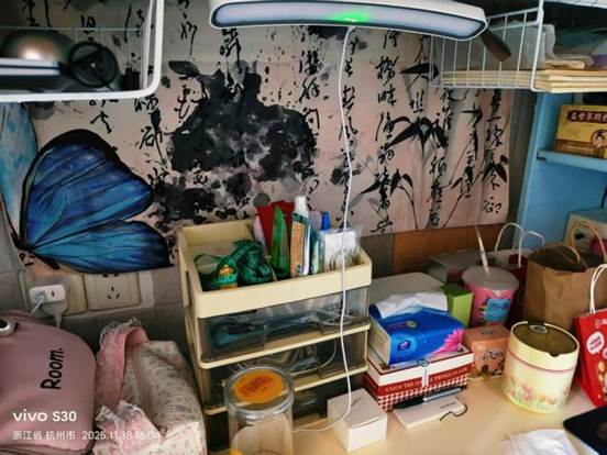 既体现国商学子的学业专注,也通过点缀,让学习空间兼具生活烟火气,实现“学在寝室、乐在寝室”的功能融合。2.暖愈:以治愈系布置消解学业压力,让寝室传递青春的柔软温度。3.青春集:个体与集体的记忆拼图装饰中的个性化物件与集体收纳的规整感,既保留室友的个体特质,又通过共同布置形成“青春集合体”,诠释寝室作为“大学记忆容器”的独特意义。