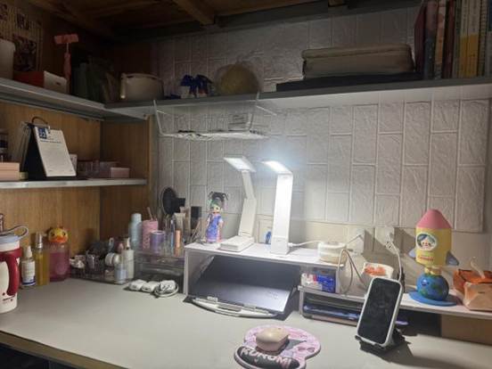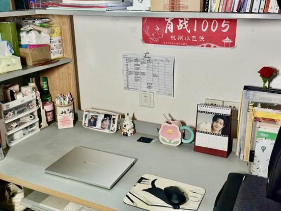 设计理念:我们的四人寝以“多元共生·个性交响”为核心设计理念,通过四张书桌的差异化布局,展现了每位成员独特的性格与生活态度,桌面在保证整洁的同时,又在色彩、功能性与情感表达上形成和谐共鸣,共同构建出既尊重个体空间又充满集体温度的栖息地。