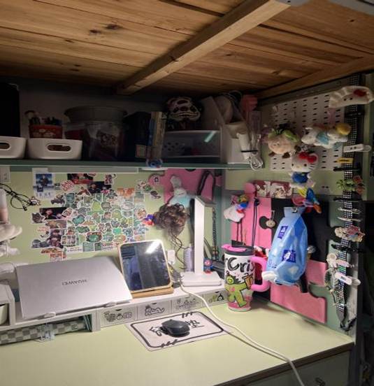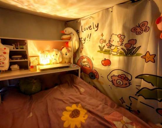 治愈氛围营造:运用可爱的玩偶、贴纸、插画等元素,传递轻松愉悦的情绪,让寝室成为“心灵充电站”。