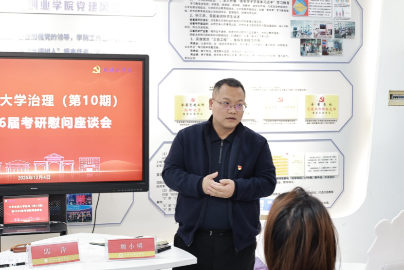 为扎实推进本科教育教学审核评估工作,持续巩固和树立优良学风,切实掌握2026届毕业生考研备考动态、传递学院对考研群体的暖心关怀,12月4日,学院于望B-112党建议事厅举办2026届毕业生考研慰问座谈会。学院党委书记、副院长邱萍,党委副书记、纪委书记顾小明,国贸系系主任李兰,国商系系主任高超,跨电系系主任陈胜男,金融系系主任韩林静,2026届毕业班辅导员,考研成功校友代表及2026届10余名考研学生代表齐聚一堂,共话备考难题,共商冲刺策略,为学子考研之路保驾护航。
