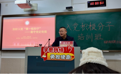 学院党委副书记、纪委书记顾小明以《扣好入党“第一粒扣子”》为主题,带领学员们学习了《中国共产党纪律处分条例》,引导同学们学纪、知纪、明纪、守纪,端正入党动机,坚守忠诚干净底线。