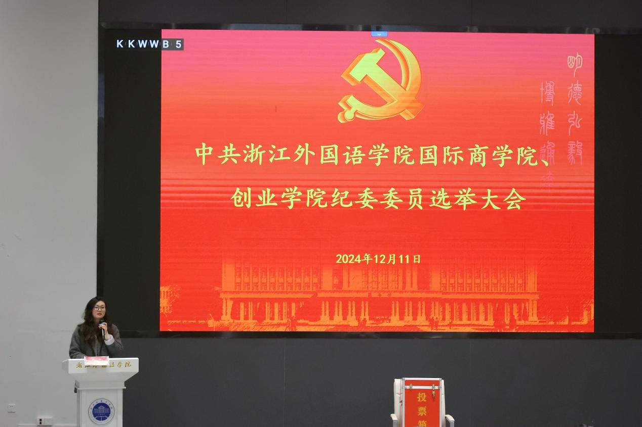 大会通过了《中共浙江外国语学院国际商学院、创业学院纪律检查委员会书记补选办法》、监票人名单,宣布了计票人名单。在监票人监督下,到会有选举权的党员以无记名投票方式,补选产生了中共浙江外国语学院国际商学院、创业学院纪律检查委员会委员。